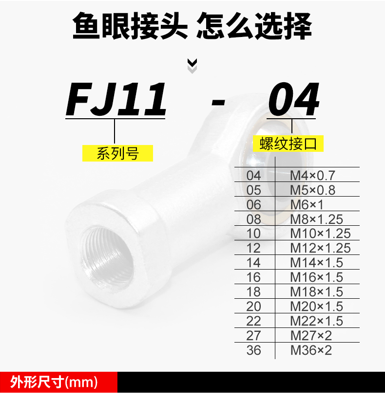FJ11-04(M4*0.7),FJ11-05(M5*0.8),FJ11-06(M6*1),FJ11-08(M8*1.25),FJ11-10(M10*1.25),FJ11-12(M12*1.25),FJ11-14(M14*1.5),FJ11-16(M16*1.5),FJ11-18(M18*1.5),FJ11-20(M20*1.5),FJ11-22(M22*1.5),FJ11-27(M27*2)魚眼接頭 詳細(xì)信息